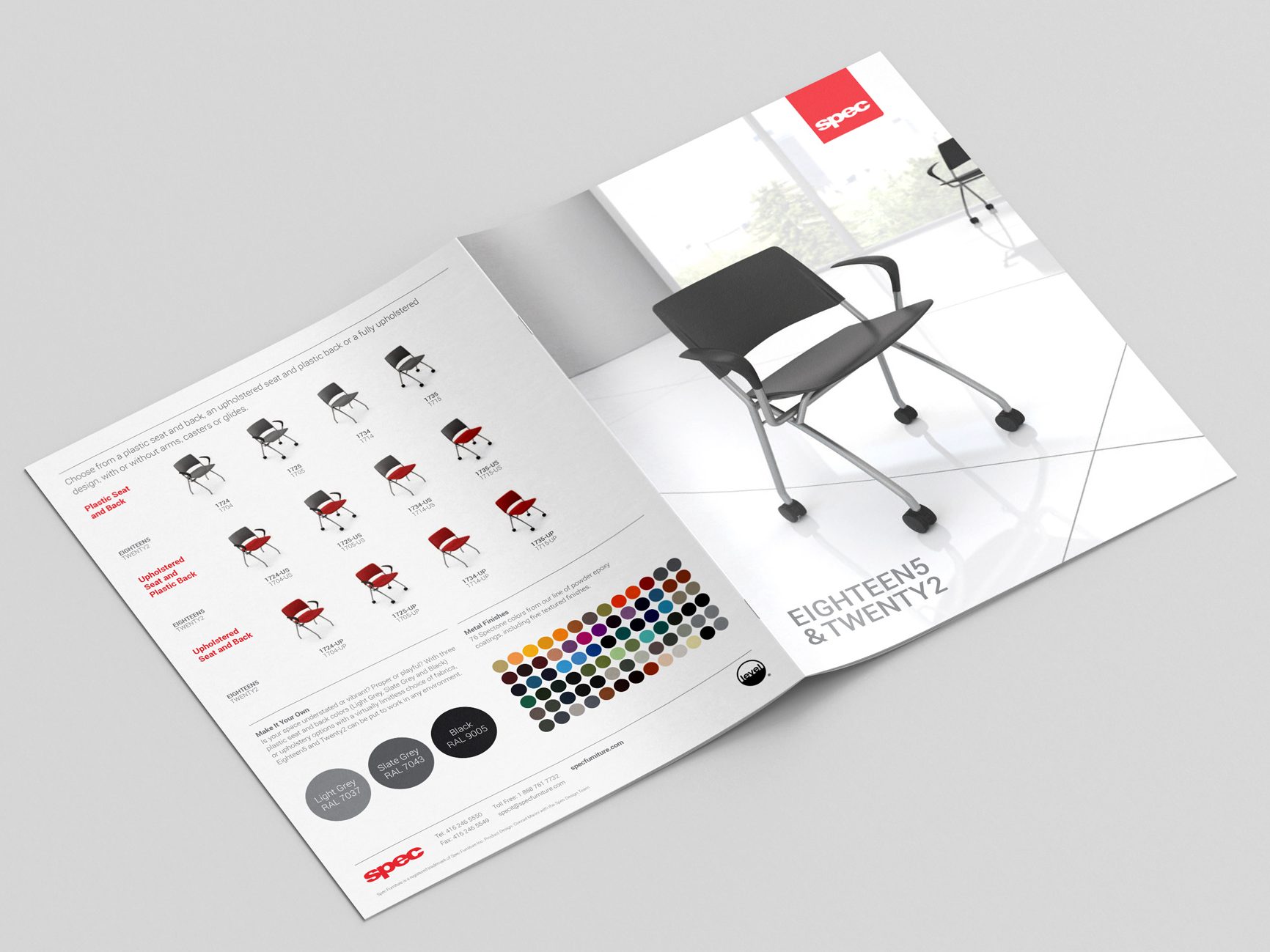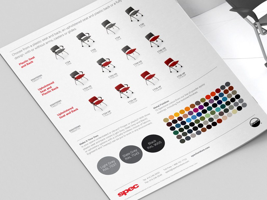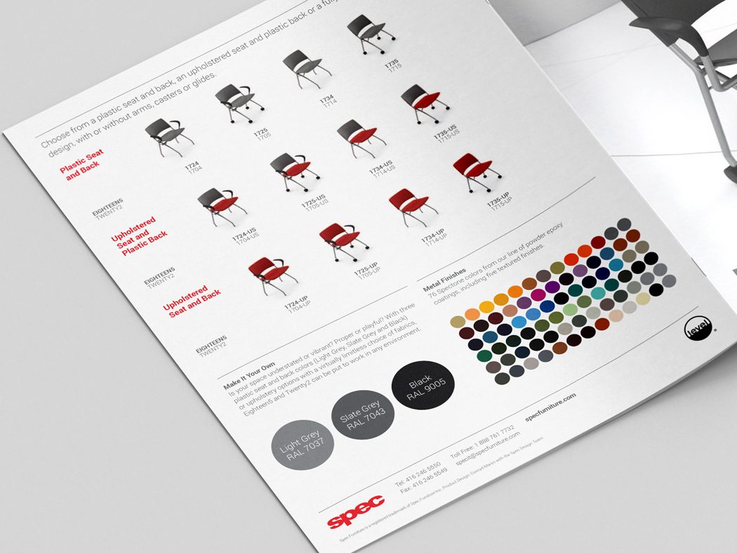 I created a catalogue design system that would work across SPEC’s expanding product lines of furniture – whether a single product or a completely new product line, and chairs or tables etc.